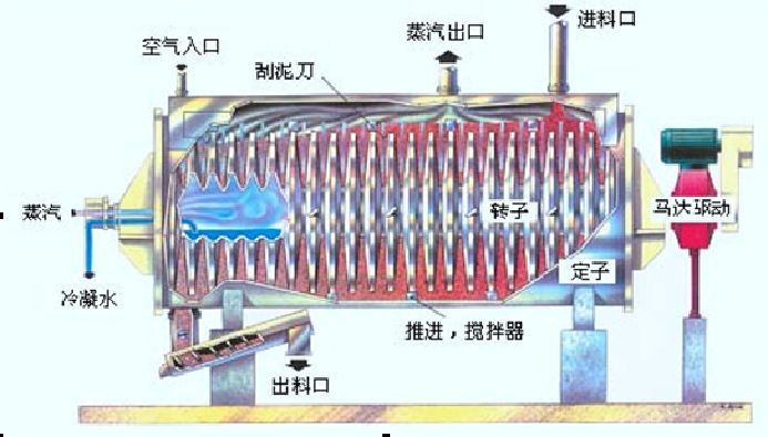 空心軸上密集排列著中空圓盤片,振幹以熱傳導為主要手段的幹燥器,依(yī)靠葉片、主軸或熱壁的熱量與汙泥(ní)顆粒的接(jiē)觸、攪(jiǎo)拌擠壓(yā)進行換熱,其中的熱量(liàng)來自填充在其中的熱介質,熱介質經(jīng)空心軸流(liú)經圓盤片。單位有效容積內傳熱麵積很大,熱介質溫度從-40℃到320℃,可(kě)以是水蒸汽,也可以是液體型:如熱水、導熱油等。間接傳導加熱,沒有攜帶空氣帶走熱量,熱量均用來加(jiā)熱物料。熱量損(sǔn)失(shī)僅為通過器體保溫層向環境的散熱。