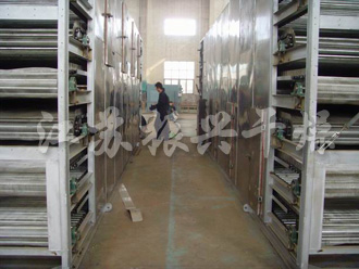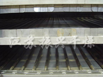 2、用於(yú)脫水蔬菜,一般使(shǐ)用三套設備串聯(lián)使用,形成初幹段、中間段及終幹(gàn)段。在(zài)初幹段中,由於物料含水量高,透氣(qì)性差(chà),故采(cǎi)用小的鋪料厚度,較快的運行速度及較高的幹燥溫度。對物料溫度不允許超過60℃的料,初幹段中,幹燥氣體溫度可高達120℃以下,終幹段內物料 停留時(shí)間是初幹段的3-6倍,鋪料厚度是(shì)初幹段的2-4倍。對於物料溫度不超過60℃的要求,可采用80℃左右的幹燥(zào)氣(qì)體。采用多段(duàn)組合能更(gèng)好的發揮帶式幹燥機的性(xìng)能,且幹燥更均勻。
