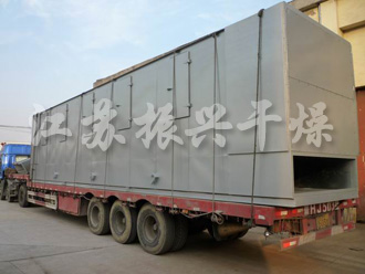 1、料鬥(dòu)中的物料由加料器經輸送帶均勻地鋪在網帶上,網采用(yòng)12-60目不鏽綱絲網(wǎng),由傳動裝置(zhì)拖動在幹燥機內移動。幹燥段由若幹個熱風(fēng)獨立循環單元組成,其中部分尾(wěi)氣由專門排(pái)濕風機排出,每一單元排出氣量均有調(diào)節閥控製。在上循環單元中,循環風機(jī)出來的風由側麵風道進入下腔(qiāng),氣(qì)流向上通過換熱器加熱,並經分配器分配(pèi)後,成噴射流吹向網帶(dài),穿過物料後進入上腔。幹燥過程是熱風氣流穿過物料(liào)層,完成熱量與質量傳遞的過程。上腔由風管與風機入口相連,一部分氣體循環,一(yī)部分溫度較低含濕量較高的氣體作為廢氣經排濕管、調節閥、排濕風機排出。下循環單元中,循(xún)環風機出來的風先進入上腔,下腔(qiāng)由側麵風(fēng)道及回風管與風(fēng)機入口相連,大部分氣(qì)循環,一部分排出,上下循環單元根據用戶需(xū)要可靈活配備,單元(yuán)數量亦可根據需要(yào)選取(qǔ)。